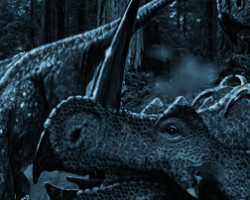 "super-croc" Deinosuchus lunging at hadrosaurs on Cretaceous river bank (production proof)