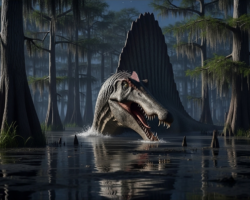 Spinosaurus under the spell of a Cretaceous bald cypress swamp full moon