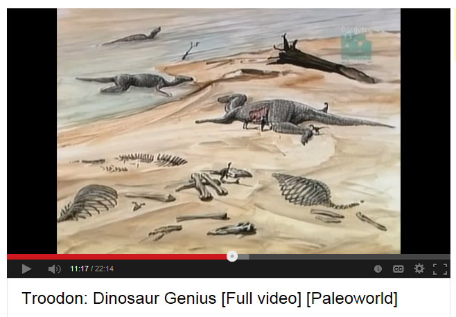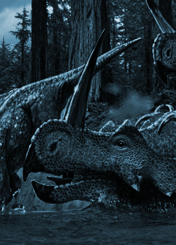 "super-croc" Deinosuchus lunging at hadrosaurs on Cretaceous river bank (production proof)