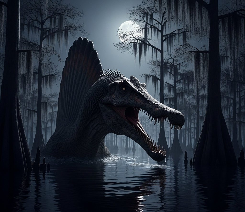 Spinosaurus under the spell of a Cretaceous bald cypress swamp full moon